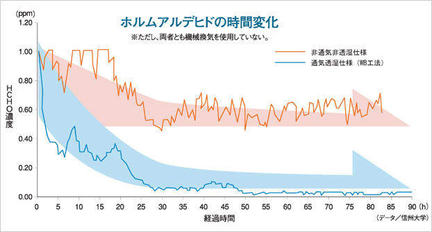 時間経過によってホルムアルデヒド濃度はどちらも下がるものの、